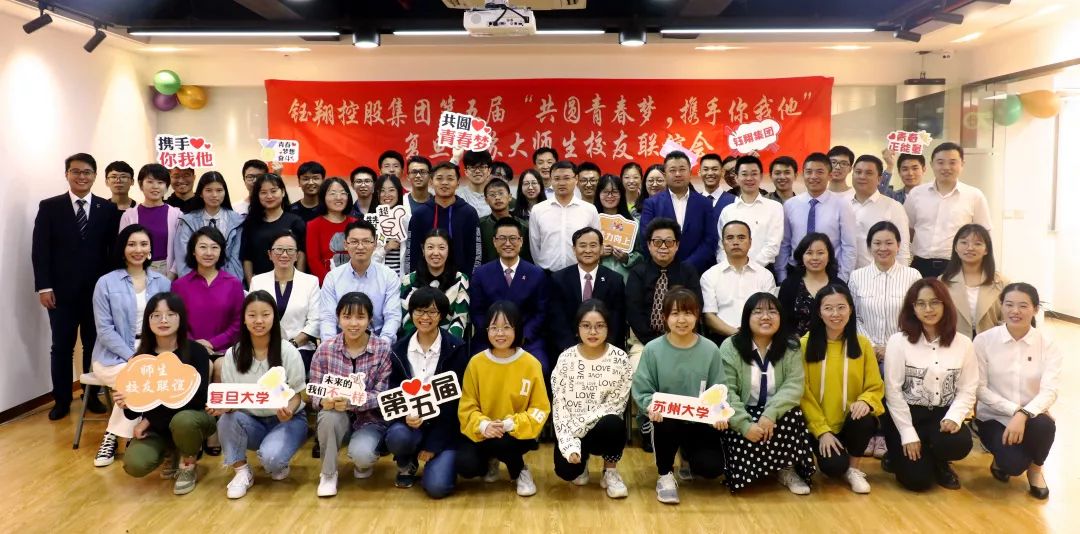 10月13日,鈺翔控股集團在總部舉辦第五屆“共圓青春夢、攜手你我他”復旦、蘇大師生校友聯誼會。復旦大學、蘇州大學帶隊領導和老師及復旦、蘇大兩校2016-2018級鈺翔獎助學金受助學生參加了聯誼會。集團董事葛衛國、黨總支書記秦祖煌、黨總支副書記朱國興、上海交通大學中國中小企業研究中心主任張毅偉、集團復旦、蘇大兩校校友及優秀員工代表出席了聯誼會。
